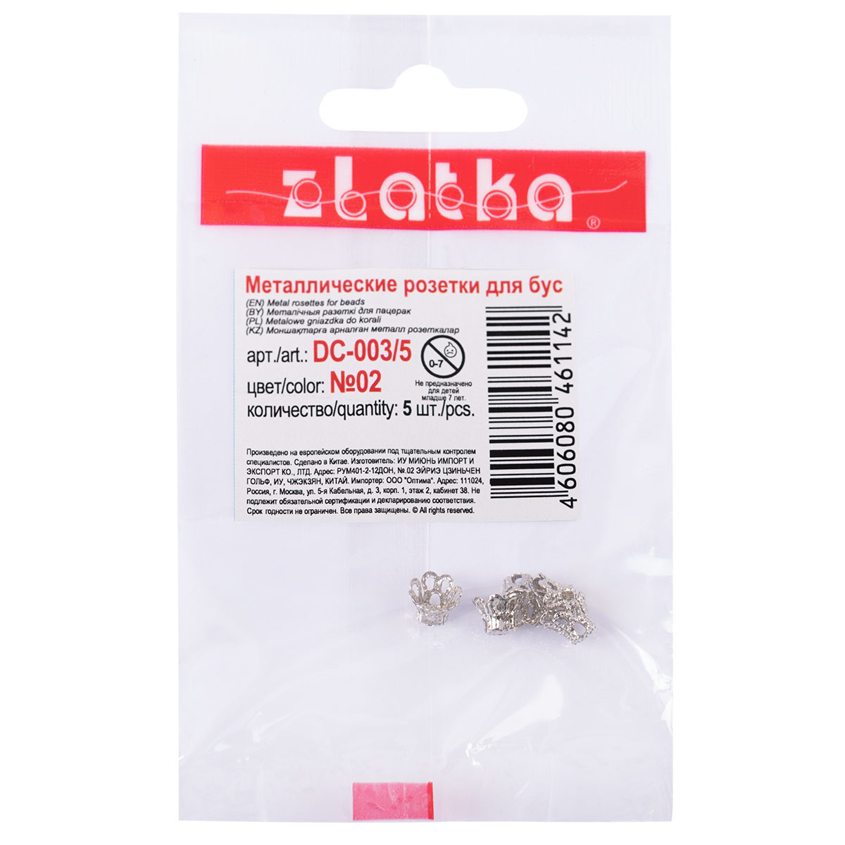 Розетка для бус " Zlatka" DC- 003/ 5 служат для декоративного обрамления бусин. Они предотвращают истирание покрытия бусин в месте их соприкосновения друг с другом и продлевают срок службы украшения. Размер розетки в разложенном виде 7 мм. Высота в собранном виде 5 мм. Диаметр отверстия 1. 5 мм. 100% железо. Сообщить о неточности в описании
